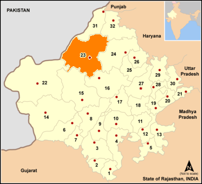 Bikaner District is a district of the state of Rajasthan in western India.The historic city of Bikaner is the district headquarters.Bikaner is also Division with the four district: Bikaner, Churu, Sri Ganganagar and Hanumangarh.